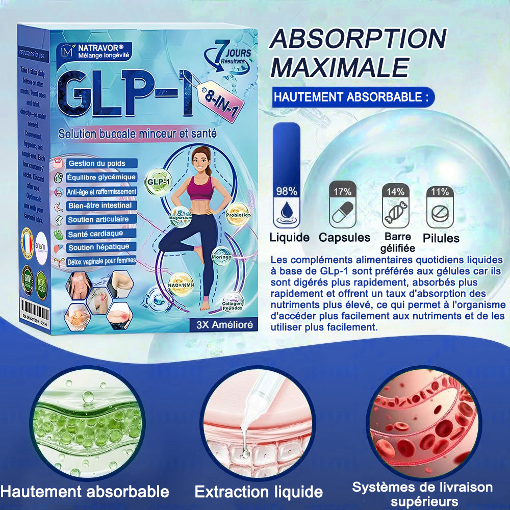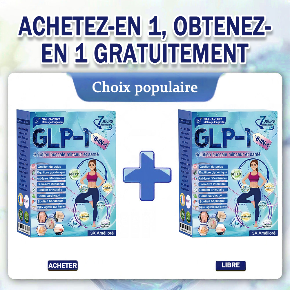 La solution buvable Natravor® Longevity Mix GLP-1 8-en-1 Minceur et Santé, issue de plus de 20 ans de recherche menée par plus de 30 experts, est conçue pour les personnes d'âge moyen et avancé. Elle associe le tirzépatide (GLP-1) à des extraits naturels pour équilibrer la glycémie, réduire l'appétit et brûler les graisses pour une perte de poids progressive et saine. Grâce à l'ajout de peptides de collagène, elle favorise la fermeté de la peau pendant l'amincissement. Fabriquée dans des installations certifiées BPF conformément aux normes américaines et européennes, elle offre une solution sûre, scientifiquement prouvée et sans aiguille pour une gestion efficace du poids et une santé durable.